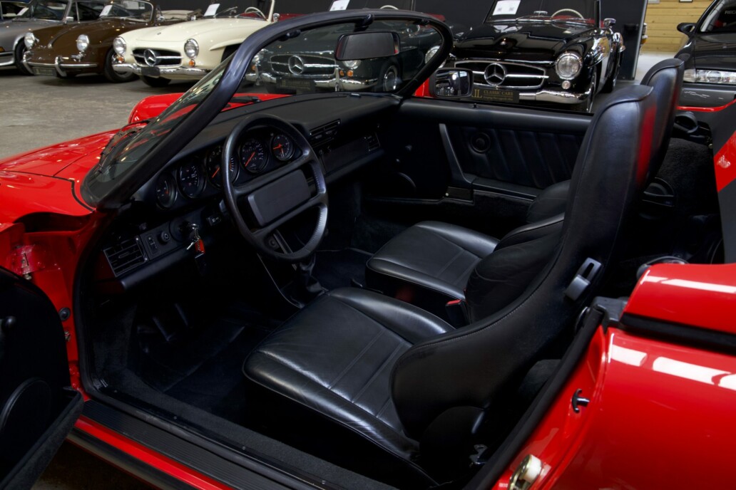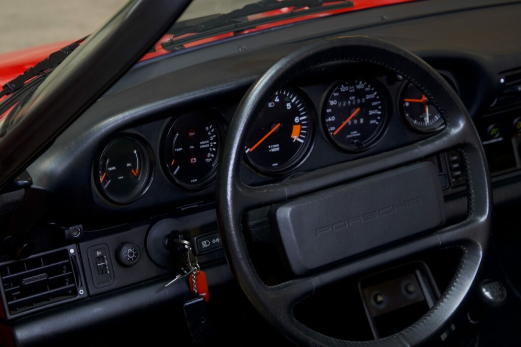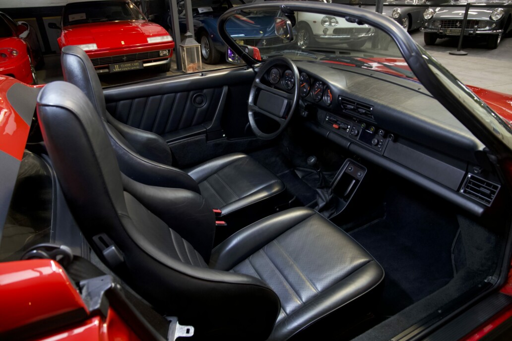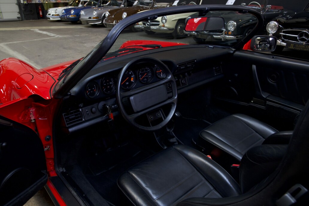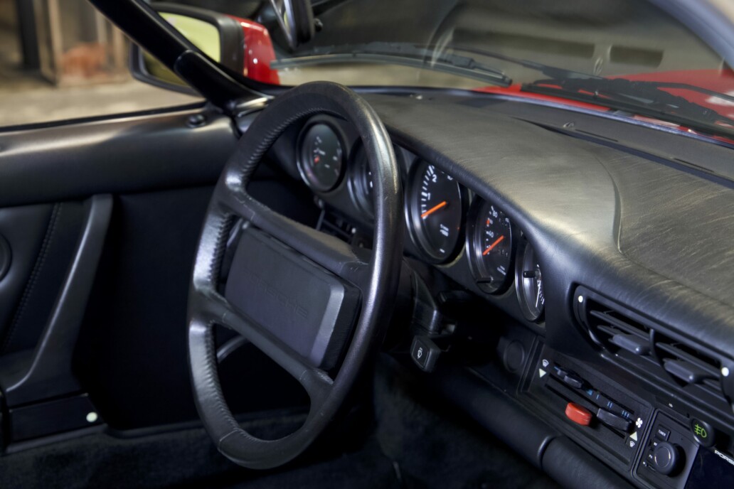 Le modèle que nous vous présentons est exceptionnel à tous égards. Avec moins de 25 000 kilomètres d’origine, une première peinture préservée et un état proche du neuf, il transporte son propriétaire dans une concession Porsche de 1989. Chaque détail respire la perfection : l’intérieur en cuir noir semble avoir traversé les décennies sans une ride, et l’on s’imagine, dès que l’on prend place au volant, parcourir les routes comme si le temps s’était figé.
